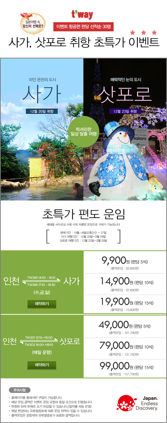 예약은 티웨이 홈페이지에서만 가능하며 한정된 좌석판매로 조기 마감될 수 있습니다.