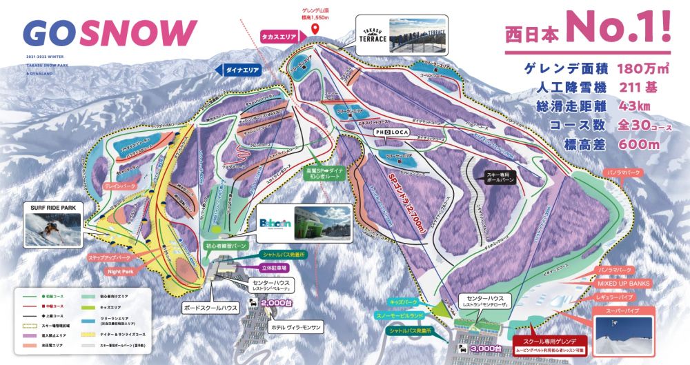 정상에서 이어지는 다이나랜드와 다카스스노우파크를 합치면 일본 굴지의 규모를 자랑하며