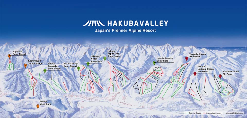 - 1998년 동계올림픽으로 알려진 나가노에는 3,000미터를 넘나드는 많은 북알프스의 연봉들을 배경으로 81개나 되는 스키장들이 산재해 있다. 하쿠바지구는 최상급자들의 프라이드 핫포네,최고의 경관과 테크니션들의 낙원 고류/하쿠바47,아름답고 다양한 즐거움의 이와다케 등 전국적 규모의 초대형 스키장들이 모여있는 곳이다. 시즌 중에는 2~3M에 달하는 풍부한 적설량과 최상의 설질을 유지하며 4월 부터는 따뜻한 햇살과 북알프스의 웅대한 경관을 바라보며 즐기는 봄스키로도 유명한 곳이다.