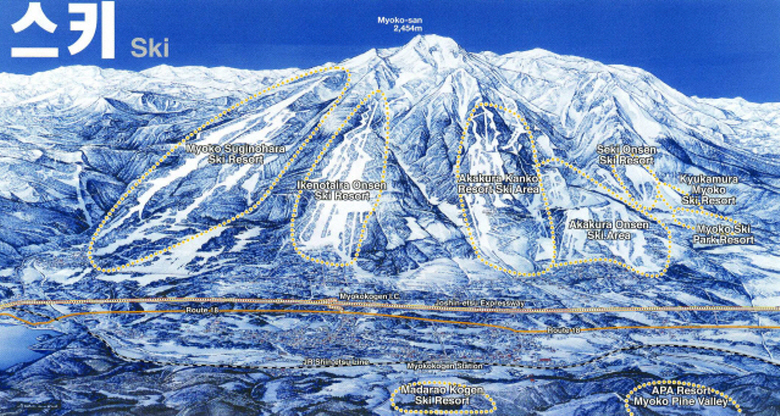 - 해발 2,454m의 묘코山은 그 신비스럽고도 아름다운 자태만으로도 많은 스키어들의 가슴을 설레게 하는 곳이다. 일본 스키 "마운틴 6" 클럽에 소속되어 있는 묘코고원은 2월 평균 3m를 넘는 풍부한 적설량과 높은 표고의 북사면에 위치, 발군의 파우더 설질을 자랑하는 곳으로 일본인이 가장 선호하는 스키리조트 TOP 3에 항상 꼽히는 곳이다. 일본스키장 최고의 표고차(1,124미터)와 최장의 다운힐(8,500미터)을 자랑하는 스기노하라 스키장, 묘코고원내에서 가장 스케일이 크며 묘코산의 아름다운 경관을 가장 잘 볼 수 있는 아카쿠라온천스키리조트, 알파인스키 뿐 아니라 크로스컨트리 코스와 장비렌탈도 가능한 이케노타이라스키장 등이 있다.