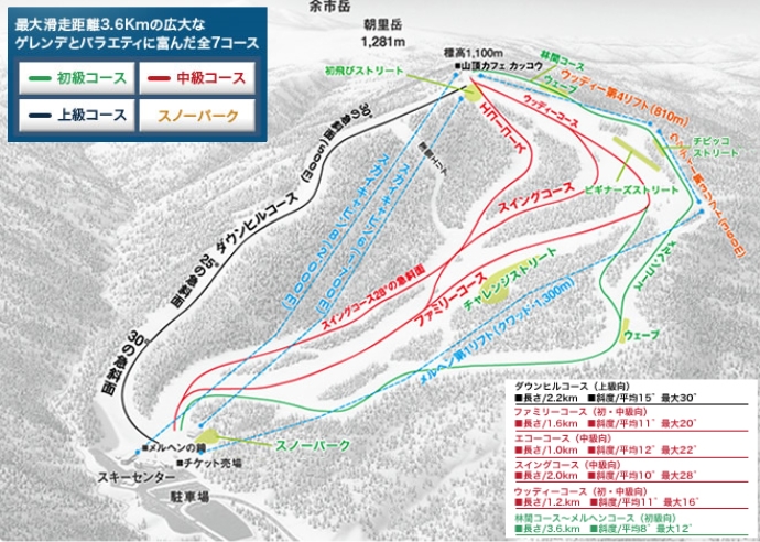 슬로프는 임간 코스 위주의 초,중급의 이미지. 코스의 폭은 넓은 편은 아니나 곳곳에 위치한 원생림이 아름다운 분위기를 만들어 낸다. 모든 코스는 FIS공인/전일본 스키연맹 공인 코스. 상급자코스는 정상으로부터 길이 2,200m/경사 30도 전후의 급사면이 베이스까지 이어진다.